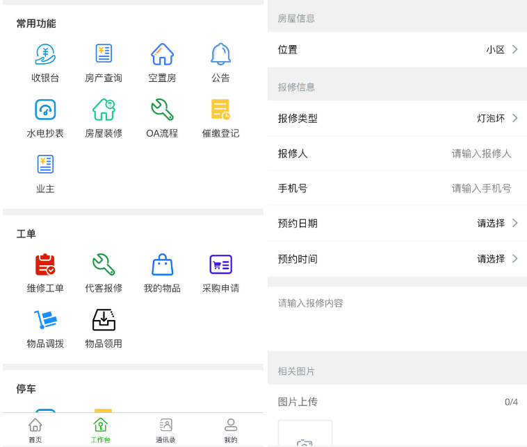 资产管理、业务管理、费用管理、采购管理、设备管理、智慧服务、保修管理、组织管理、智慧停车、巡检管理