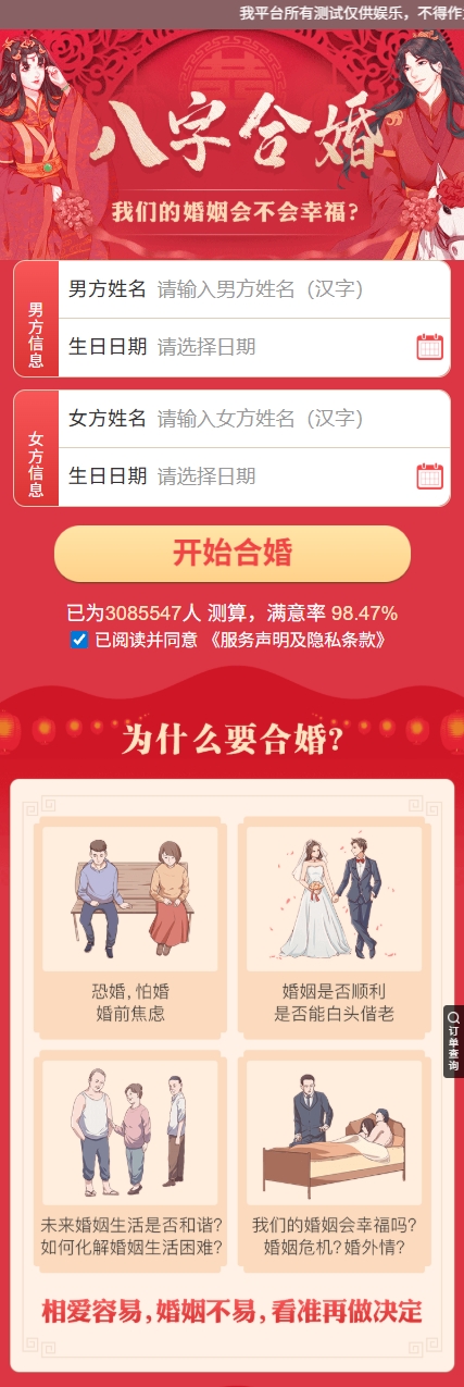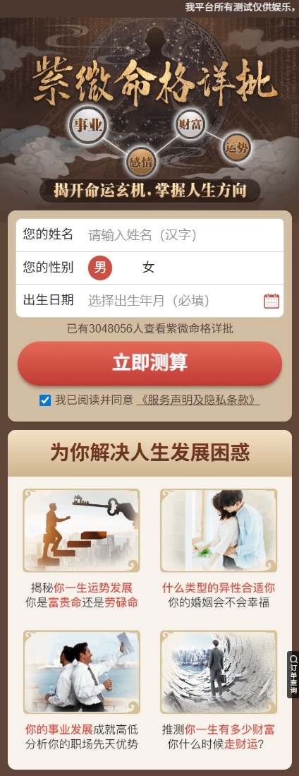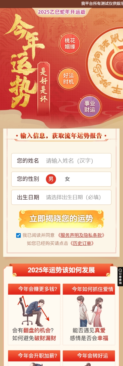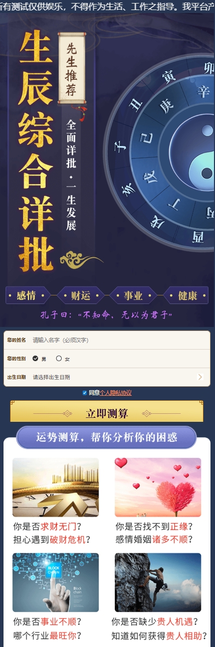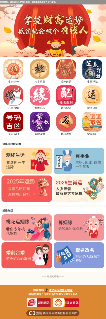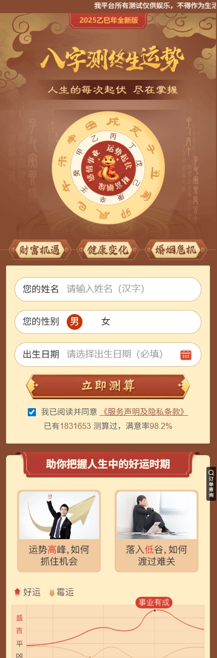 八字精批、事业财运、姓名分析、宝宝起名、公司测名、姓名配对、综合详批、姻缘测算、牛年感情、PC版测算、八字合婚、紫微斗数、鼠年运程、月老姻缘、许愿祈福、号码解析、塔罗运势、脱单占卜、感情继续、脱单占卜、塔罗爱情、心理有你、能否复合、暗恋对象、是否分手、爱着别人、大师服务(包含多项功能)共计30余项功能,全网功能全,完善的版本。