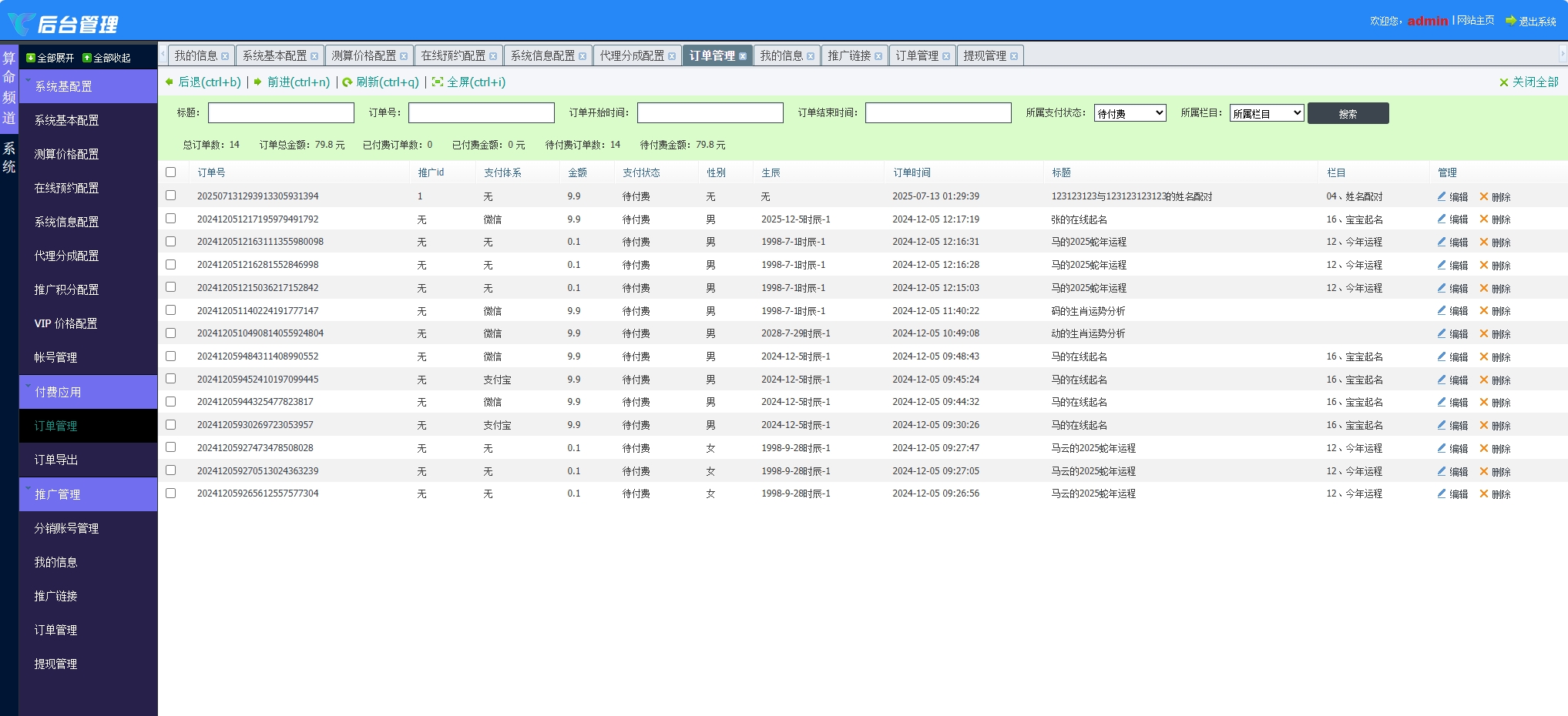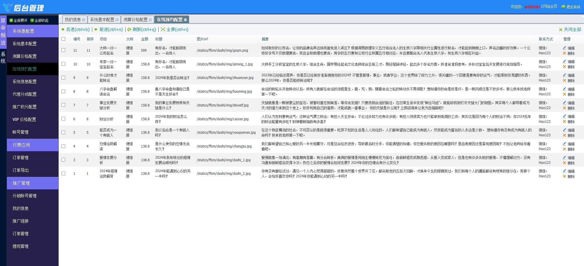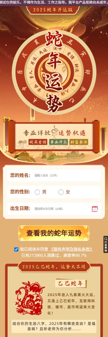八字精批、事业财运、姓名分析、宝宝起名、公司测名、姓名配对、综合详批、姻缘测算、牛年感情、PC版测算、八字合婚、紫微斗数、鼠年运程、月老姻缘、许愿祈福、号码解析、塔罗运势、脱单占卜、感情继续、脱单占卜、塔罗爱情、心理有你、能否复合、暗恋对象、是否分手、爱着别人、大师服务(包含多项功能)共计30余项功能,全网功能全,完善的版本。