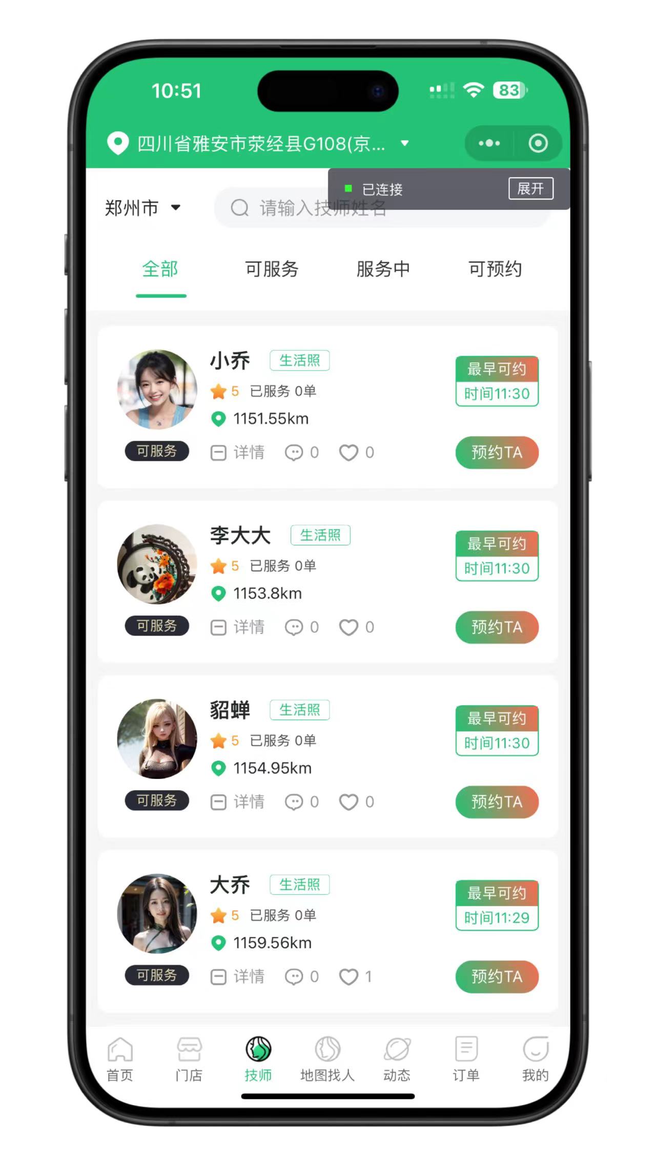 技师选择、预约服务、优惠券、订单、技师服务、收藏、售后、评价、问题反馈、储蓄余额、会员等级、技师推荐
