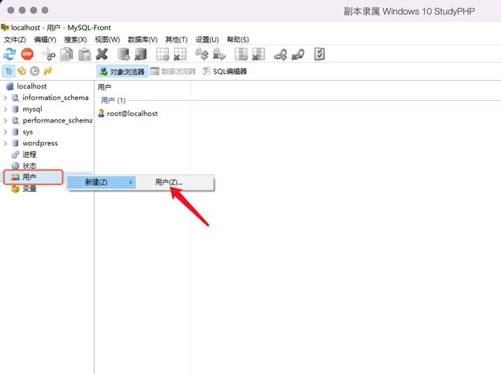 首先,我们需要返回到本地主机数据库界面,然后在界面左侧右键点击“用户”,在弹出的菜单中选择“新建”和“用户”。