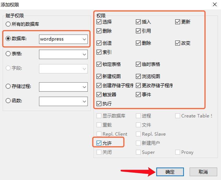 接下来,我们需要在上述页面中选择上方的“权限”选项卡。在“授予权限”栏中,我们选择数据库,并指定为'wordpress'数据库。然后,在右边勾选所有权限,并允许控制'wordpress'数据库。同时,我们还限制该用户不能读写其他数据库。