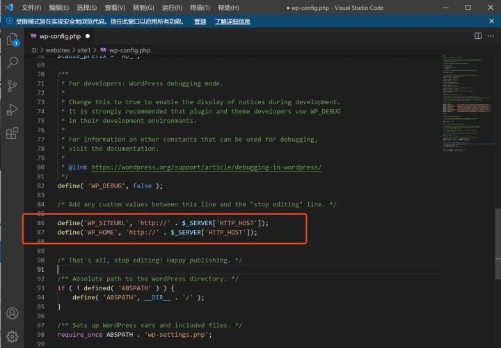 首先,我们需要找到WordPress的config文件。这里,我们继续使用Visual Studio Code软件。点击左上角的“文件”按钮,在“打开文件”选项卡中,找到我们网站根目录中的wp-config.php文件,然后将以下字符段输入其中: